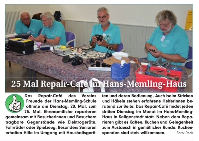 Beim Repair-Café im HANS-MEMLING-HAUS helfen mittlerweile zwölf ehrenamtliche Reparateure ganau in solchen Fällen.