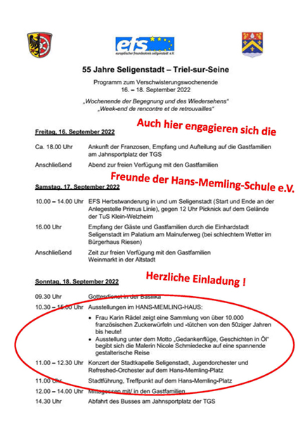 Die Veranstalter freuen sich, dass es wieder gelungen ist die beteiligten Künstler und Musiker zu motivieren, das Fest mit Ihrem Können zu bereichern und damit für die Lebendigkeit des Ortes zu sorgen. Alle Teilnehmer tun dies völlig ohne Gage - um Spenden wird daher gebeten - und unterstützen damit das Vereinsziel ganz im Sinne des diesjährigen Mottos des bundesweiten Denkmaltages `Wert-voll: unbezahlbar oder unersetzlich´. Die Freunde der HMS setzen sich für eine vollständige Sanierung dieses besonderen Denkmals Seligenstadts ein, um damit auch die Nutzung der Obergeschosse in naher Zukunft zu ermöglichen.