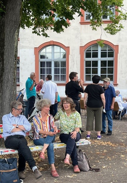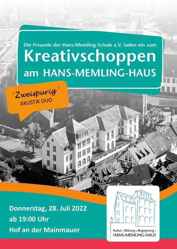 Aber los geht es schon vorher! Und zwar auf dem malerischen Hof vor dem Gebäude schon ab Donnerstag, dem 1. Juli. Die Freunde der Hans-Memling-Schule laden ihre Mitglieder, Freunde, Bekannte und alle Bürger der Stadt am Abend ab 19:30 Uhr zu ihrem traditionellen Kreativschoppen ein und beginnen so den Reigen der Sommerveranstaltungen. Bei dem einen oder anderen Glas Wein unter den alten Bäumen an der Mainmauer lässt sich hier trefflich über die Welt philosophieren. Und vielleicht entsteht hierbei auch die eine oder andere Idee für kommende Veranstaltungen im neuen HANS-MEMLING-HAUS.