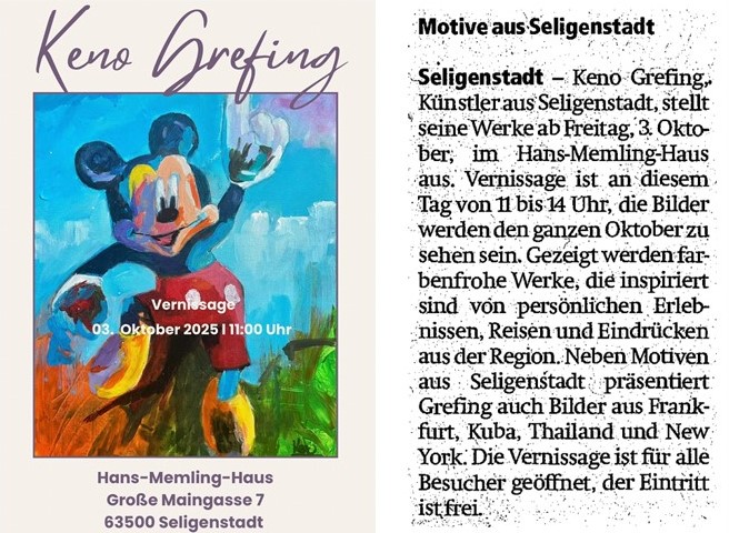 Begegnung; im Hans-Memling-Haus und auf dem Hof gibt es kostenfrei ein buntes Programm für Jung und Alt. Alle sind herzlich eingeladen, so Geschäftsführer der HMH gUG Alexander Hartmann, vorbeizukommen um eine entspannte Atmosphäre und ein abwechslungsreiches Programm zu erleben!Die Veranstalter freuen sich besonders auf die Ausstellung des Hanauer Kunstvereins `Art13 e.V.´, deren Vernissage bereits am Sonntag, 7. September von 14 bis 17 Uhr im Hans-Memling-Haus stattfindet. Seine Mitglieder zeigen vielseitige Werke zeitgenössischer Malerei, Zeichnungen, Skulpturen, Digital Art und erstmals auch Kurzfilme zweier junger Filmkünstler, die für den Bundeswettbewerb `Jung und Abgedreht 2025´ nominiert sind. Die Künstlergruppe steht seit 2013 für kreative Vielfalt, Austausch und Förderung von Kunstschaffenden aller Altersgruppen. |