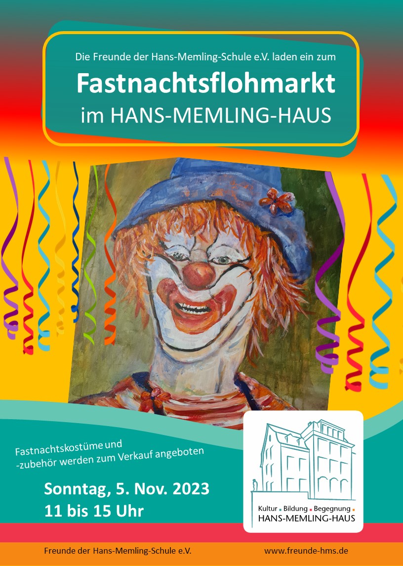 Fastnachtsfreunde aufgepasst! Habt Ihr im Keller oder auf dem Dachboden noch dutzende Fastnachtshüte oder -schals und jede Menge Kostüme, die Euch nicht mehr passen? Wie bereits angekündigt veranstalten die Freunde der Hans-Memling-Schule e.V. den zweiten Flohmarkt für Fastnachtskostüme und alles Zubehör. Am Samstag 16. November 2024, zwischen 13 und 17 Uhr können Anbieter im HANS-MEMLINGHAUS gegen eine kleine | |