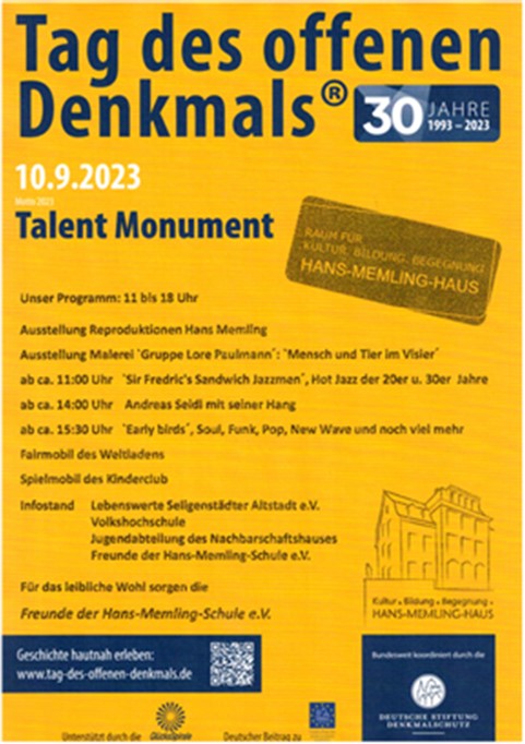 Zum Tag des offenen Denkmals am Sonntag, 14. September 2025 zwischen 11 und 18 Uhr veranstalten die Freunde der Hans-Memling-Schule e.V. wieder ein Fest der