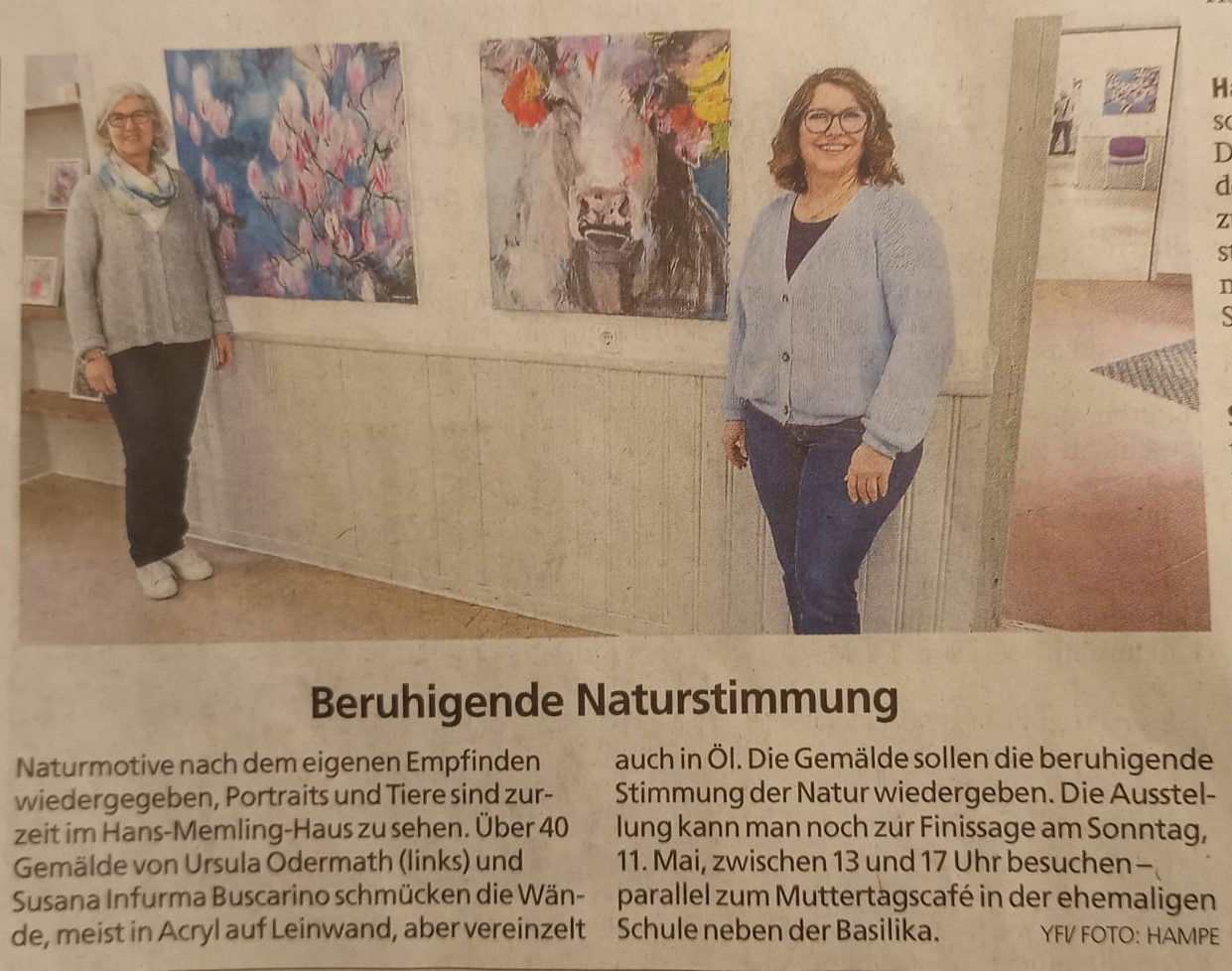 Auf Einladung unseres Vereins stellen am kommenden Sonntag, 13. April, 14 – 17 Uhr in einer Vernissage zwei Malerinnen Ihre Werke vor: Neben zwei weiteren Terminen der Ausstellungsöffnung am Ostermontag, 21. April und Donnerstag, 1. Mai, jeweils 14 – 17 Uhr, findet die Finissage im Rahmen unseres Muttertagscafé am Sonntag 11. Mai statt.
