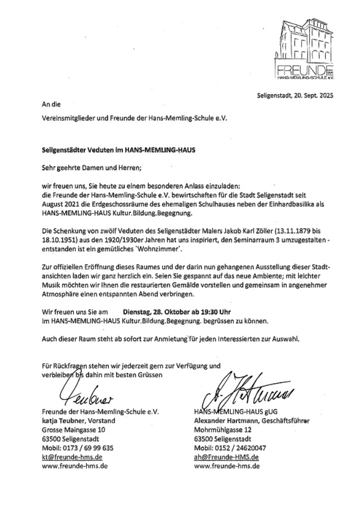 Am 1. August um 11 Uhr ist es soweit. In einem Festakt auf dem schönen Hof vor der ehemaligen Hans-Memling-Schule übergibt der höchste Repräsentant unserer Stadt, der Stadtverordnetenvorsteher Dr. Richard Georgi den Schlüssel des Gebäudes. In Empfang nehmen diesen die Vorsitzende des „Vereins der Freunde der Hans-Memling-Schule Seligenstadt e.V.“ Katja Teubner und Alexander Hartmann, der Geschäftsführer der neu gegründeten Betreibergesellschaft „HANS-MEMLING-HAUS gUG“. „Dieses ist ein großer Tag für die vielen Bürger und Bürgerinnen dieser Stadt und die Freunde der Hans-Memling-Schule, die mit ihrem Engagement diesen Ort der Kultur und Begegnung möglich gemacht haben“, sagt Katja Teubner, „ und so sind alle herzlich eingeladen, an diesem Festakt teilzunehmen und einen ersten Blick in die schön hergerichteten Räume im Erdgeschoß des HANS-MEMLING-HAUSes Kultur.Bildung.Begegnung zu werfen.“